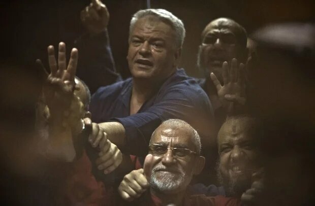 Photo : le chef égyptien des Frères musulmans Mohamed Badie (en bas, au centre) adresse un signe de la main dans la cage des accusés alors qu’il assiste à son procès, aux côtés du président islamiste évincé Mohamed Morsi (non visible sur la photo), au Caire, le 16 juin 2015 (AFP).