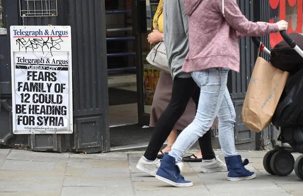 Photo : Des piétons passent devant un marchand de journaux présentant le journal local avec en gros titre les craintes exprimées au sujet de la disparition d'une famille de douze personnes à Bradford, au nord de l'Angleterre, le 16 juin.