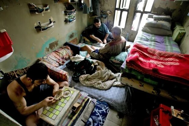 Photo : 7 avril 2006, des prisonniers dans leur cellule à la prison de Roumieh (nord-est de Beyrouth). Ce centre de détention compte parmi les plus vastes au Moyen-Orient ; prévu pour seulement 1 500 pensionnaires, il en accueille 4 500 (AFP).
