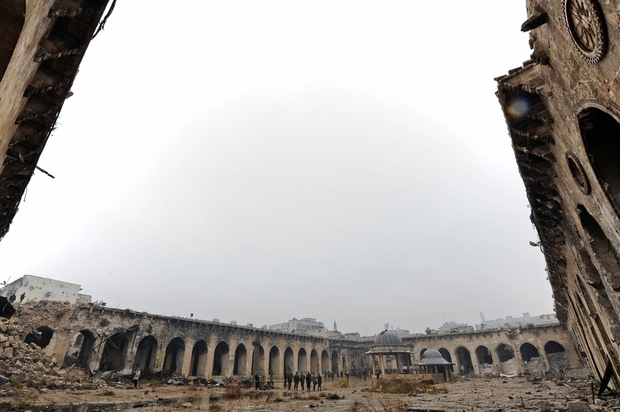 Photo : Des hommes marchent près de ruines à l’intérieur de la mosquée des Omeyyades d’Alep, en Syrie, le 13 décembre 2016 (Reuters).