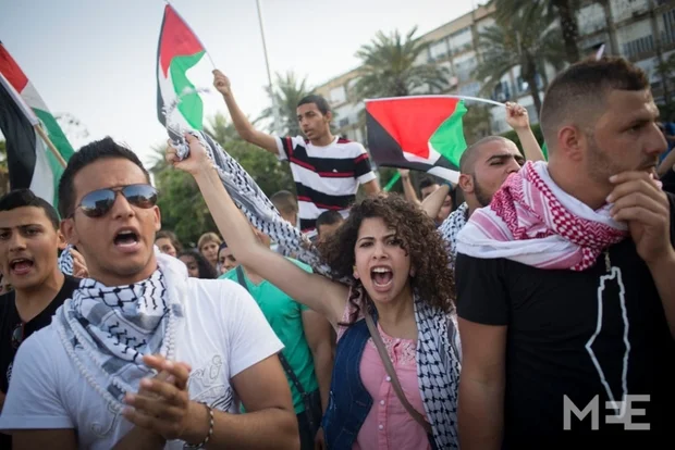 Environ 2 000 citoyens palestiniens d’Israël ont manifesté à Tel Aviv le 28 avril 2015 (MEE/Oren Ziv et Akram Drawshi)