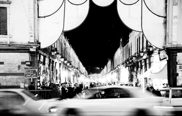 L'odeur de la poudre à canon surpasse le parfum de jasmin qui fait la réputation de Damas. Des soldats se tiennent au coin des rues, armés jusqu'aux dents pour anticiper toute infiltration de rebelles dans la vieille ville. Aux pieds de la statue du grand sultan musulman Saladin (dont l'Occident se souvient à travers la guerre des Croisés), des ordures sont parfois empilées jusqu'aux chevilles du personnage. La statue se dresse face à la citadelle de Damas (autrefois le donjon de l'Etat), aux portes de l'ancien bazar al-Hamidiyah. Ce marché en forme d'arche est désormais rempli de mendiants, de kiosques illégaux et de marchands ambulants.