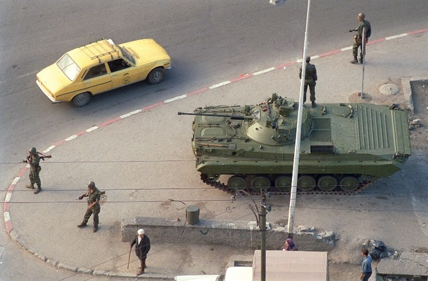 Photo : un char stationne en faction à un carrefour d'Alger, le 10 octobre 1988. Une vingtaine de personnes ont été tuées au cours d'une manifestation, le même jour dans le quartier de Bab-el-Oued (AFP).