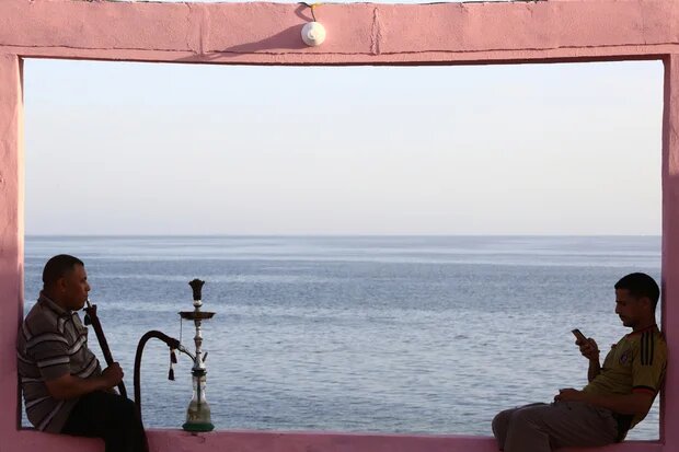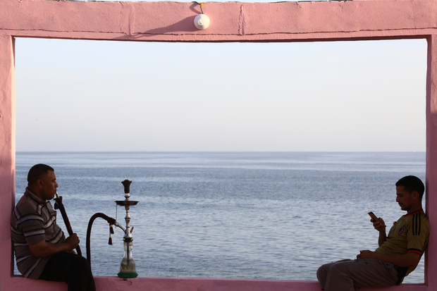Photo : deux hommes sont assis sur un muret donnant sur la mer Rouge dans un café populaire situé au nord-ouest de la ville saoudienne d’al-Wajh, le 25 avril 2016 (AFP).