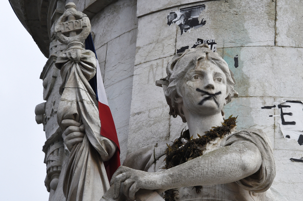 Photo : une statue qui fait partie de la statue centrale de Marianne sur la place de la République, où a eu lieu un rassemblement du souvenir le 10 janvier 2016 pour marquer l’année écoulée depuis qu’1,6 million de personnes s’étaient pressées dans la capitale française dans une démonstration d’unité après les attaques contre l’hebdomadaire Charlie Hebdo et un supermarché juif (AFP).