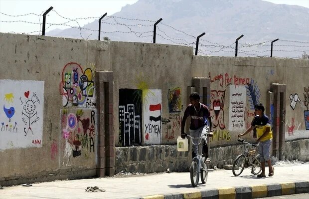 Photo : des enfants yéménites regardent des peintures murales sur la guerre dans le pays sur les murs de l’Université de Sanaa, le 17 mars 2016 (AA).