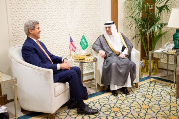 Photo : le secrétaire d’Etat américain John Kerry (à gauche), lors de sa rencontre avec le nouveau ministre des Affaires étrangères saoudien, Adel al-Jubeir, dans la capitale de l’Arabie saoudite Riyad, le 7 mai 2015.