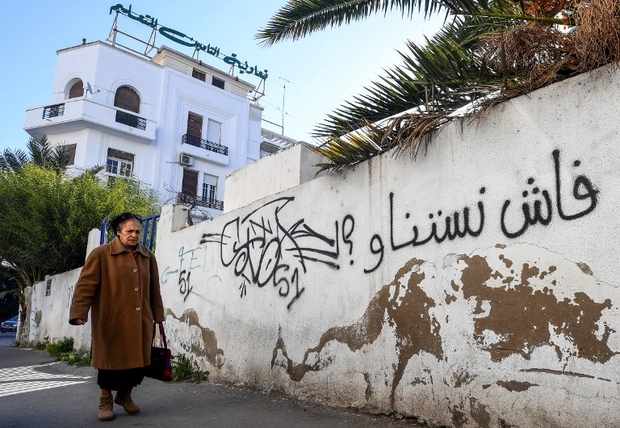 Photo : une Tunisienne passe devant un graffiti qui demande « Qu’attendons-nous ? », en signe de protestation contre les hausses de prix, à Tunis, le 25 janvier (AFP).
