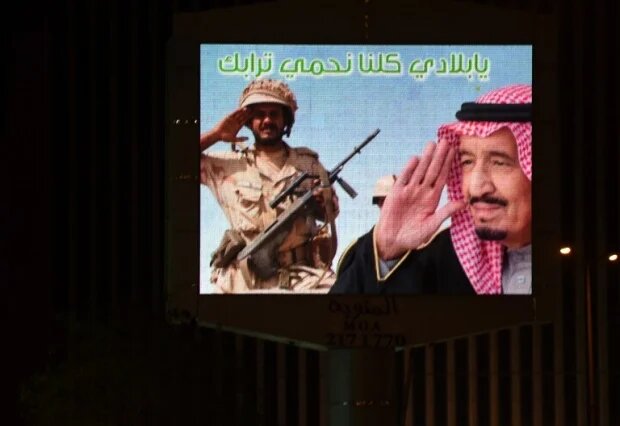 Photographie dans une rue de Riyad, capitale saoudienne, montrant un panneau d'affichage avec une image d'un soldat et du roi saoudien Salmane ben Abdelaziz al-Saoud sur laquelle est écrit « mon pays, nous protégeons tous ton sol », le 15 avril 2015 (AFP)