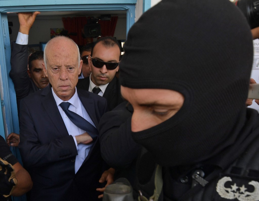 Kais Saied quitte un bureau de vote après avoir voté, à Tunis, le 13 octobre 2019 (AFP)