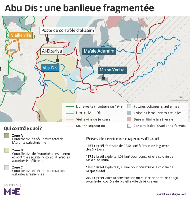 Bien qu’environ 3,5 km² d’Abu Dis – soit 14,8 % – soient classés dans la zone B, la majeure partie de la banlieue – environ 20 km², soit approximativement 85 % – est classée dans la zone C et donc sous contrôle israélien.