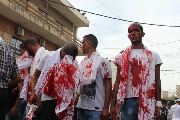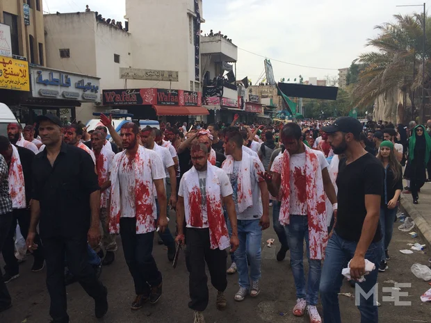 De jeunes hommes couverts de leur propre sang marchent dans les rues de Nabatieh en scandant des slogans en mémoire de l’imam Hussein (MEE/Lizzie Porter)