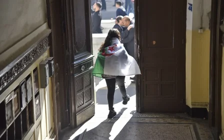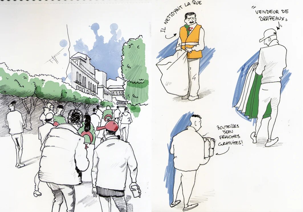 Mounir croise un ami, Abdou, qui habite tout près. Les deux compères décident de suivre la foule qui emprunte la grande rue Hassiba Ben Bouali pour accéder au centre-ville et place Maurice Audin, épicentre des manifestations depuis le 22 février. Des centaines de personnes marchent mais tous ne sont pas des manifestants : on croise des vendeurs d’écharpes aux couleurs de l’Algérie et de drapeaux (algérien et palestinien), des volontaires qui, déjà, nettoient trottoirs et chaussées et des jeunes qui distribuent gratuitement des bouteilles d’eau fraîche.