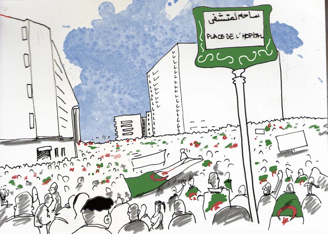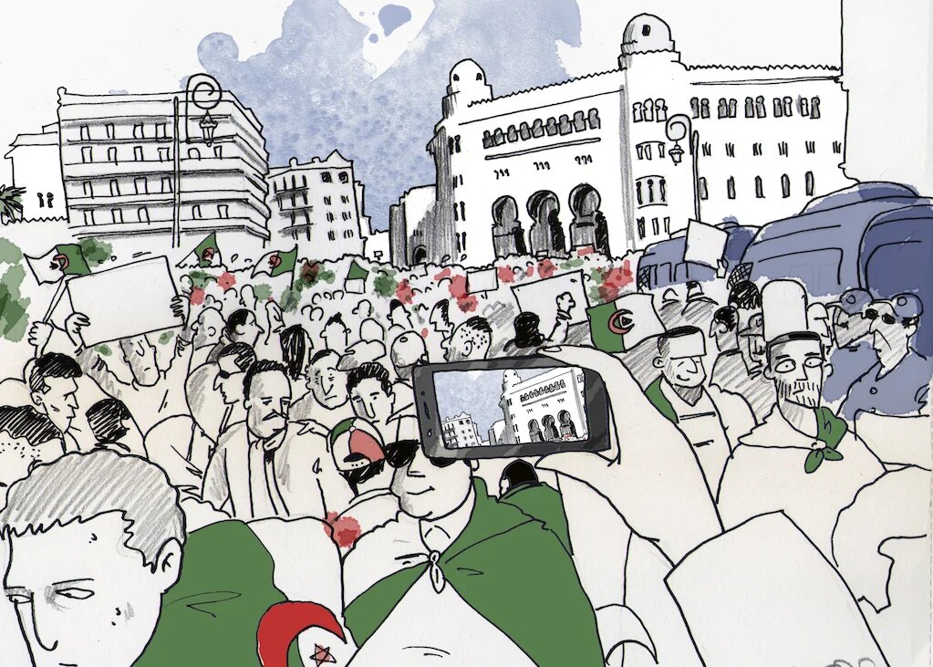 Il est à peine 13 h 30, la place et les rues autour de la Grande Poste sont noires de monde. L’ambiance est festive, les familles se mélangent aux cortèges des supporters qui assurent l’animation : vuvuzela, derbouka, mégaphone… Les slogans fusent : « Le peuple veut faire tomber le régime ! », « Bouteflika, on ne te donne même pas une minute de plus ! », « Pouvoir assassin ! ». Les forces anti-émeutes sont là, stationnées sur les bords de la route. Elles se contentent de regarder ces milliers de personnes qui n’arrêtent pas d’arriver de partout. Mounir entend un policier commenter : « C’est comme au stade, ils se gèrent très bien ces jeunes ! »