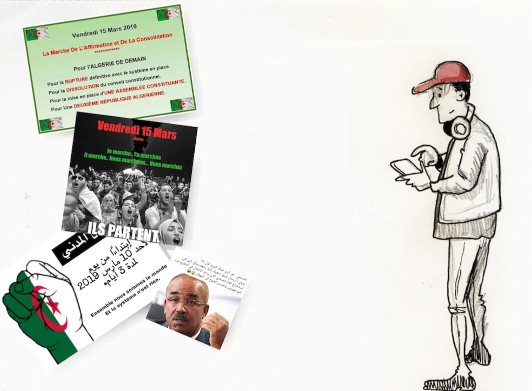 Mounir ne lâche son téléphone que pour faire du sport. Il reçoit sans cesse des notifications sur les différents appels à manifester contre les propositions du président Abdelaziz Bouteflika, qui, le 11 mars, a annoncé l’annulation de la présidentielle d’avril avec une prolongation de son mandat. Mounir s’impatiente. Il attend fébrilement le lendemain au point de faire une insomnie qu’il meuble en consultant les réseaux sociaux où s’affichent vidéos et photos, chants des supporters et anecdotes sur les trois marches précédentes.