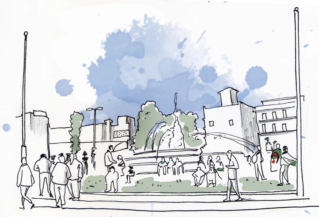 Des jeunes, des familles, des personnes âgées commencent à se rassembler autour de la fontaine de la place. Certains portent des drapeaux algériens comme des capes. Une vingtaine de fourgons de la police stationnent un peu plus loin, au-dessus de l’entrée du grand hôpital Mustapha Pacha.