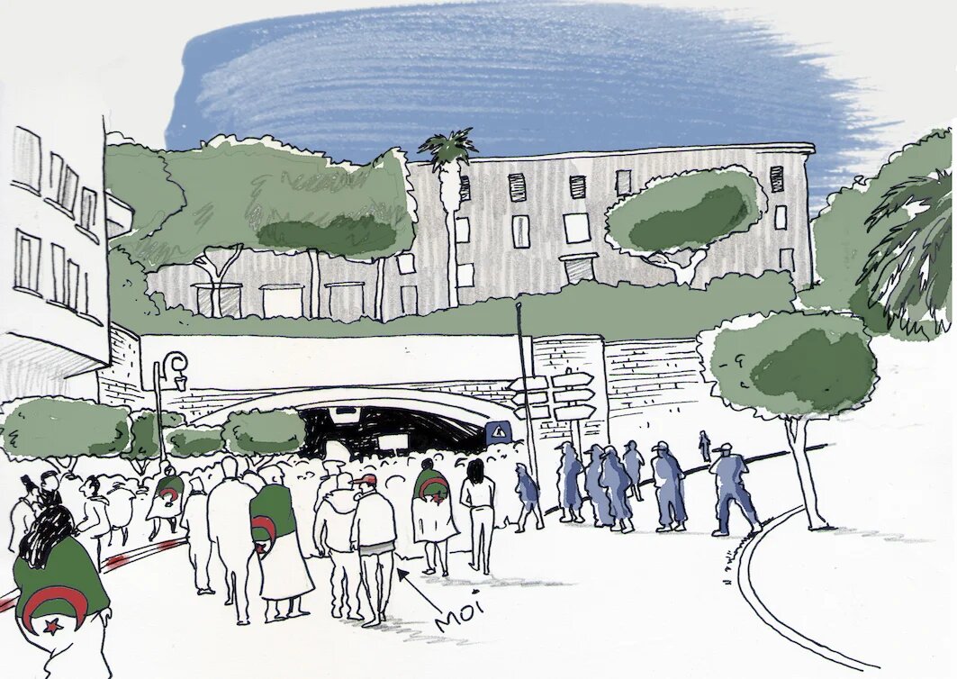 La foule tourne entre la Grande Poste et la place Maurice Audin en empruntant le tunnel des facultés qui passe sous la fac centrale. À droite, la police bloque le passage vers le palais du gouvernement, rue du docteur Saâdane.