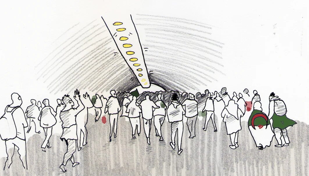 À l’intérieur du tunnel des facultés, résonnent les slogans chantés en chœur. Les fumigènes, la foule, les drapeaux déployés et cette lumière au bout… Mounir se croit dans un film de science-fiction. La chair de poule. Les larmes. Mounir et Abdou sont tellement émus qu’ils ne ressentent ni la pression des corps, ni la chaleur, ni le bruit.