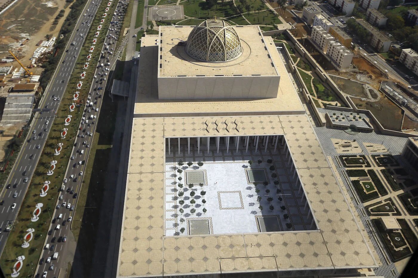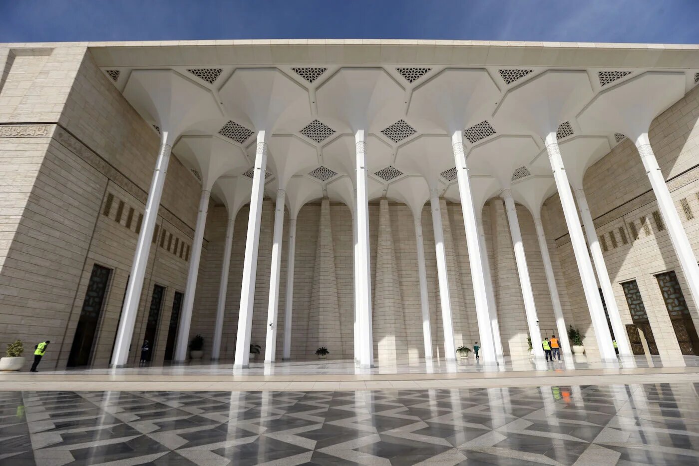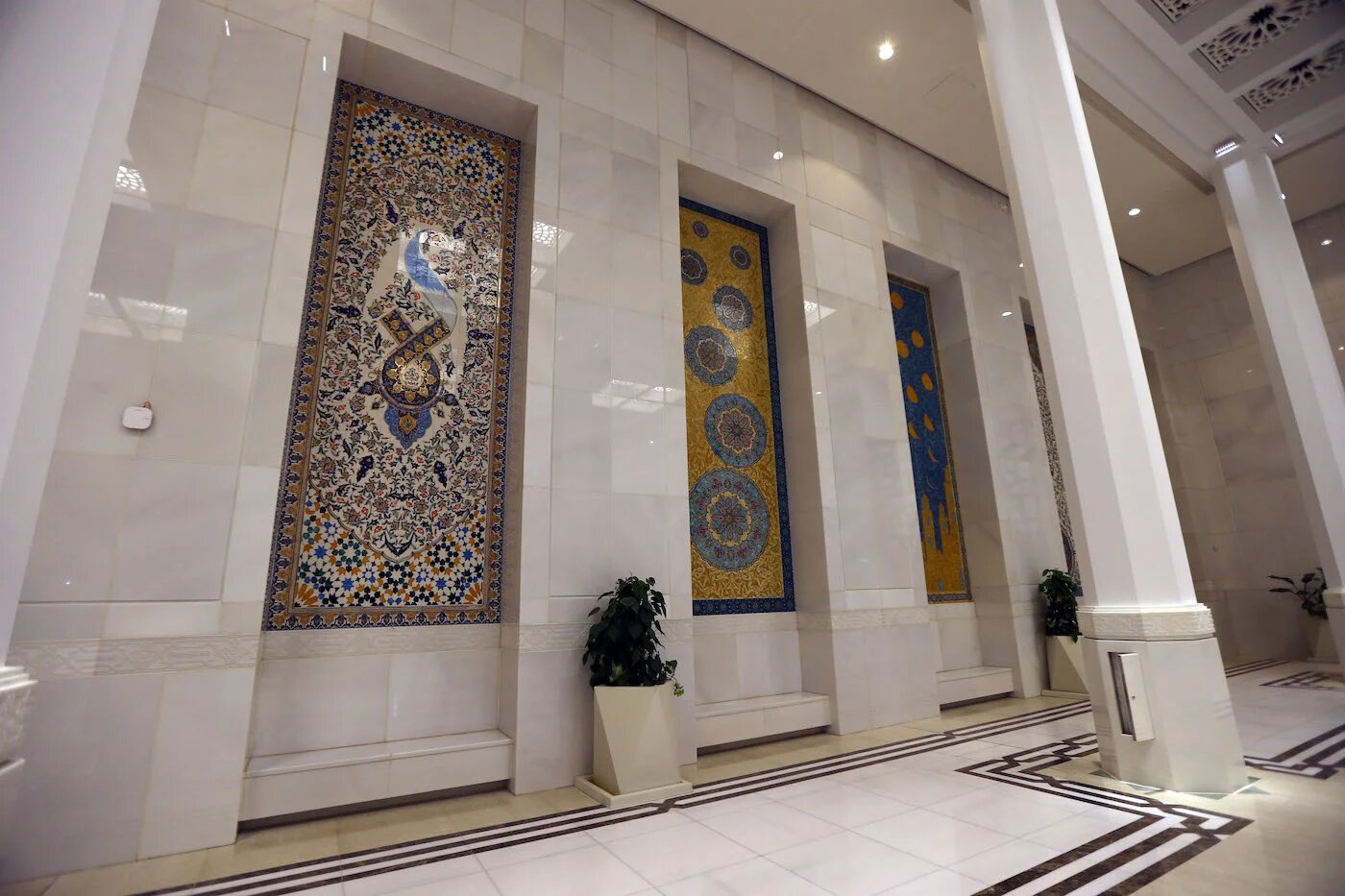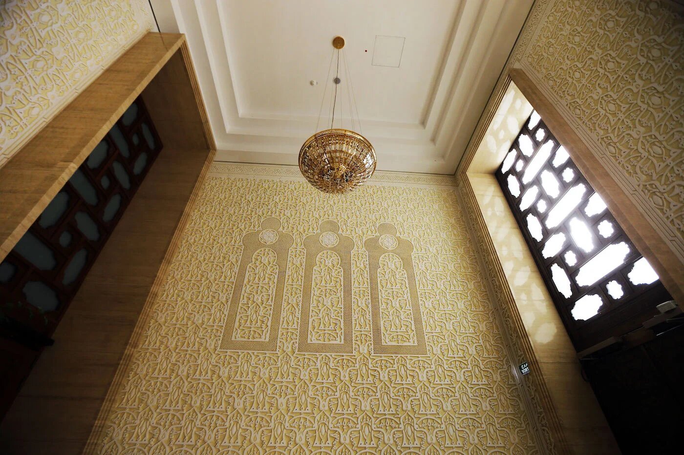 Les employés s’activent pour les derniers préparatifs de la cérémonie, devant l’entrée VIP, au sol en marbre et aux façades recouvertes, comme l’ensemble du complexe, de travertin. Devant, se trouve un énorme bassin en forme de croissant, aux abords recouverts de fleurs, et un héliport. L’entrée de droite donne accès aux salons privatifs de l’imam, là où il accueillera délégations et invités, mais pourra aussi travailler puisqu’à l’étage se trouve une bibliothèque.