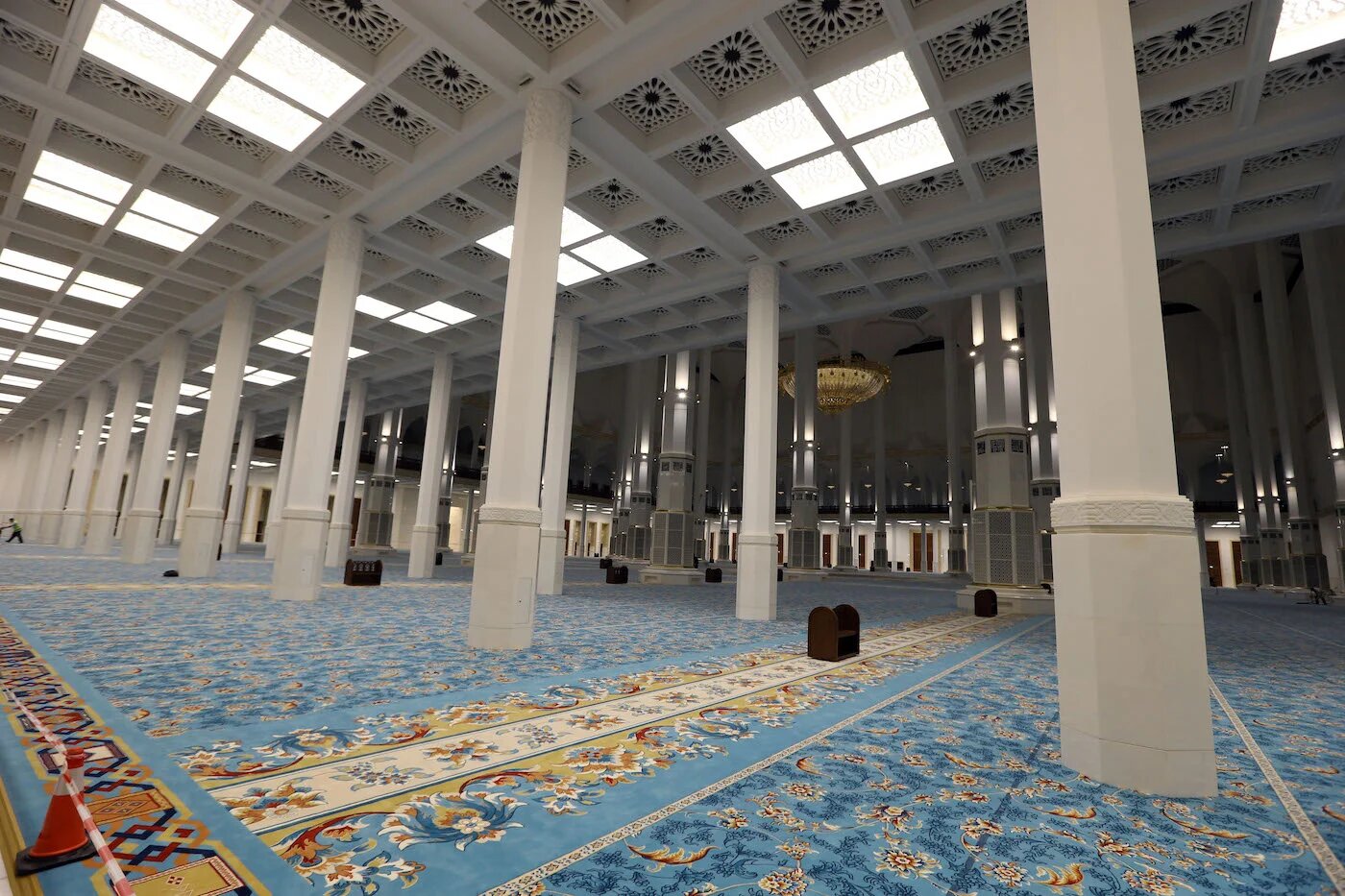 Dans la salle de prières, se trouve le plus grand lustre du monde, un titre jusque-là détenu par celui de la mosquée Cheikh Zayed à Abou Dabi, aux Émirats arabes unis. Composé de 357 000 cristaux Swarovski qui captent la lumière des projecteurs pour la miroiter dans la salle, il pèse 9,70 tonnes et mesure 13,70 mètres de diamètre. Plongé dans un bain d’or de 24 carats, il présente les tasbih (invocations) ciselées sur toute sa circonférence. Pour l’installer, il a fallu monter un échafaudage jusqu’à la première coupole pour placer les 38 câbles d’acier à partir desquels les éléments du lustre, livrés en kit, ont progressivement été suspendus.