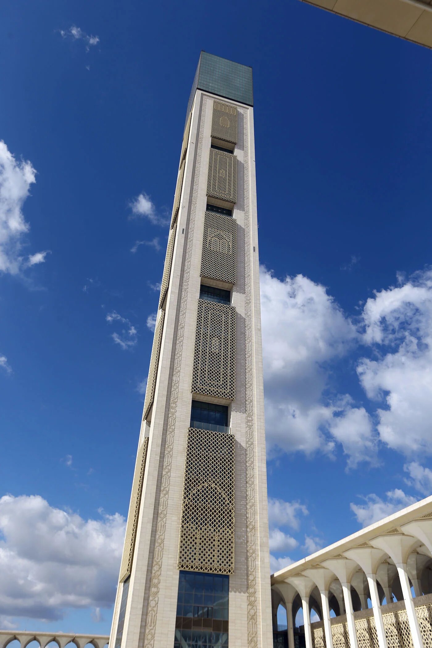 Le minaret, carré comme les minarets traditionnels des mosquées maghrébines, comprend 42 étages – le public pourra se rendre jusqu’au 38e, où ont été placées des longues vues pour observer la ville à 380 degrés – et dix-sept ascenseurs. Quinze étages sont consacrés à un musée d’histoire et d’art islamique, encore non aménagé, et huit à un centre de recherche.