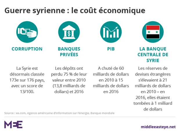 5. Le manque d’argent : les banques publiques syriennes et les quatorze banques privées du pays ont subi des pertes considérables pendant la guerre et n’ont pas les liquidités nécessaires pour investir sérieusement dans la reconstruction. Les dépôts dans les banques commerciales privées ont plongé à 3,5 milliards de dollars en 2016 contre 13,8 milliards de dollars en 2010, selon la Banque mondiale.