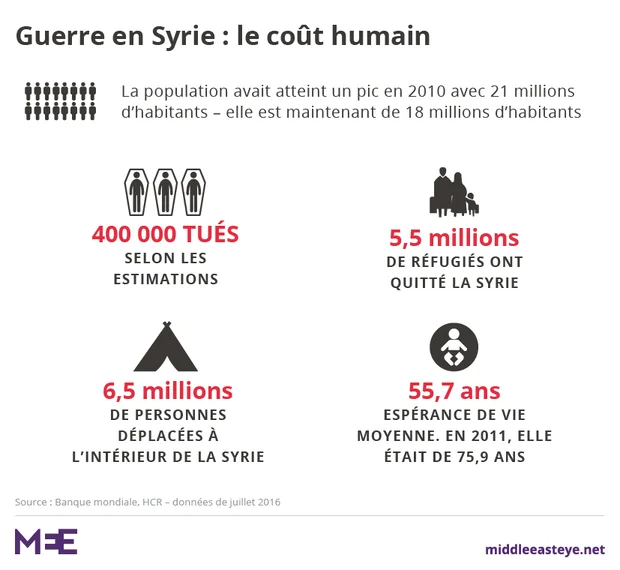 Le conflit qui dure depuis sept ans en Syrie n’est toujours pas résolu. Des millions de Syriens vivent désormais à l’extérieur de ses frontières, souvent dans des camps de réfugiés. Les combats se poursuivent à travers le pays. Les infrastructures ont été anéanties, pour un coût cumulé estimé à 226 milliards de dollars (189 milliards d’euros) pour la Syrie.