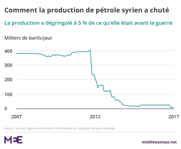 En comparaison, la Syrie produisait 375 000 bpj en 2010, les derniers chiffres disponibles avant le conflit, soit seulement 0,2 % environ du total mondial. Ce chiffre a désormais chuté : le budget de Damas n’était que de 5 milliards de dollars en 2016.