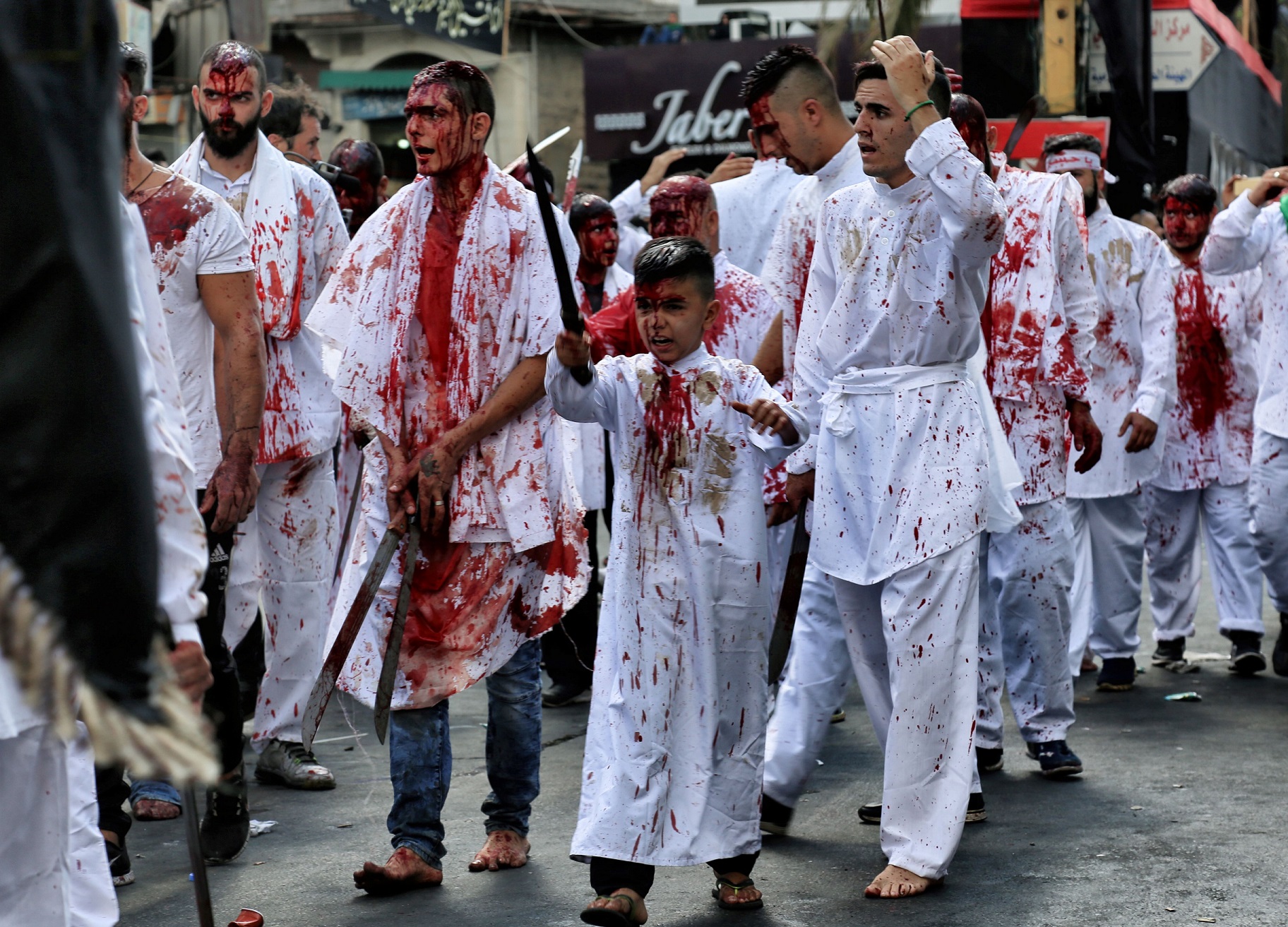 NABATIEH, Liban – « Viens ici toi », hurle un homme, rasoir coupe-choux à la main. Il parle à un garçon d’environ 8 ans, sous le regard de sa mère et de ses amis. Il lui donne deux coups secs sur le crâne, le garçon sautille, se frappe la tête. « Haydar ! Haydar ! », entonne-t-il pour se donner du courage. Haydar signifie « lion », c’est le surnom de l’imam Ali, que les chiites considèrent comme successeur légitime du prophète Mohammed.
