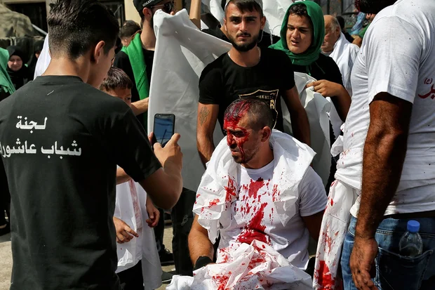 Nous sommes au dixième jour de l’Achoura, dans la ville libanaise de Nabatieh, 70 kilomètres au sud de Beyrouth. Ce dimanche, les chiites ont commémoré la mort de l’imam Hussein, petit-fils du prophète Mohammed, tué pour avoir refusé de prêter allégeance au calife omeyyade Yazid. Ils revivent sa mort, ainsi que celle de ses 72 compagnons, en se flagellant et en s’infligeant des blessures.