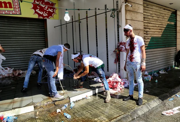 Sur les trottoirs jonchés de détritus, certains hommes se lavent le visage et les bras ; la chaleur de la journée fait sécher le sang rapidement. Des draps blancs imbibés de rouge sont jetés sur le côté, avec le reste des ordures. « Tout sera nettoyé dans l’après-midi, assure Rima, c’est pareil chaque année. »