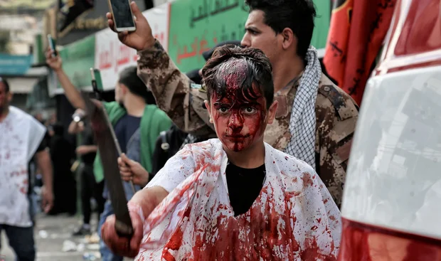 Ce dimanche, ils étaient des milliers dans les rues, avec une idée en tête : le tatbir. Cette pratique consiste à se taillader le crâne à l’aide d’une lame ou d’une épée, puis à frapper l’entaille à plusieurs reprises pour que le saignement se poursuive. D’autres pratiquent l’auto-flagellation à l’aide de chaînes.