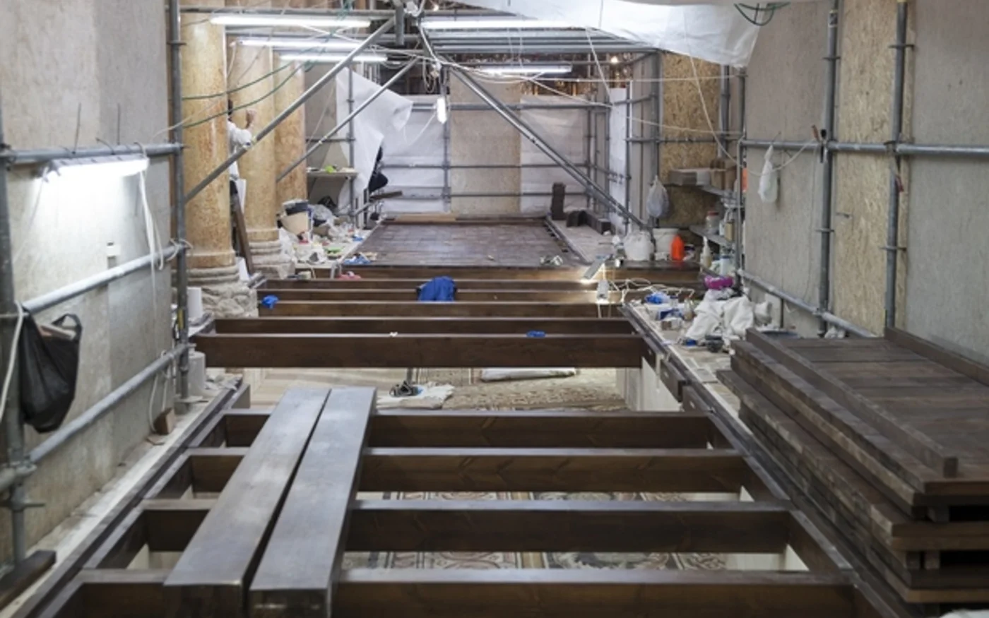 Maintenant que les sols en mosaïque sont terminés, les dirigeants de l’église ont demandé à Piacenti de les recouvrir de panneaux de plancher en bois, faciles à soulever, pour les montrer aux touristes et aux pèlerins lors de visites guidées, tout en évitant que l’œuvre ne soit piétinée.