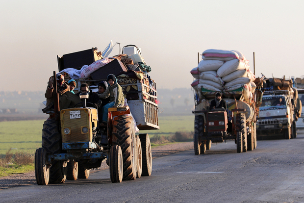 Des Syriens fuient les combats dans la province d’Idleb, près de la ville de Saraqeb (AFP)