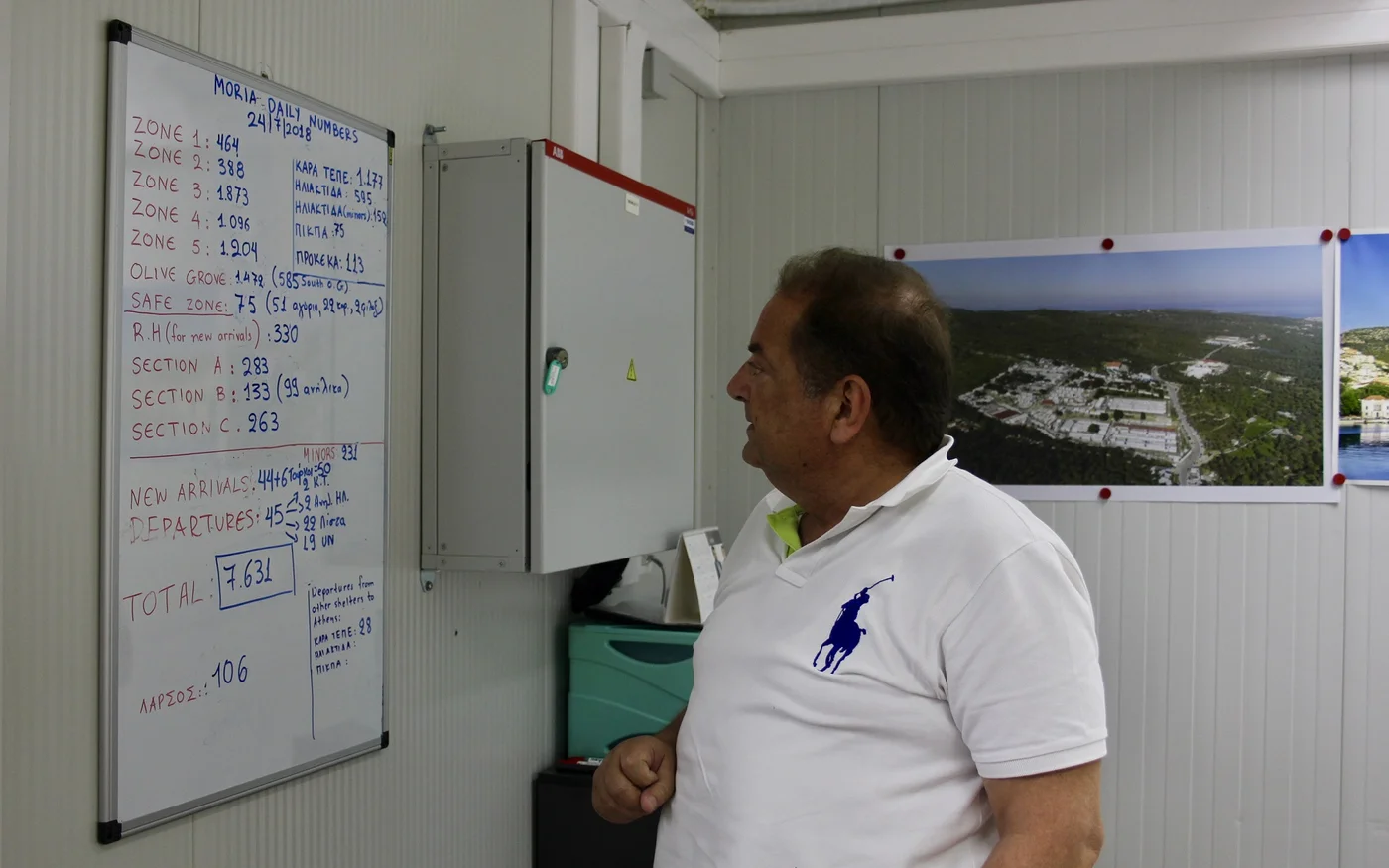 « Moria dispose d’une capacité de 3 000 personnes, mais en accueille aujourd’hui plus de 7 500. On est devenus la deuxième ville de l’île en terme de population », raconte, las, le directeur du camp. En charge du centre depuis son ouverture en 2015, Yannis Barbakakis coordonne toute l’organisation d’un camp d’accueil censé être transitoire, mais qui pour beaucoup devient permanent.