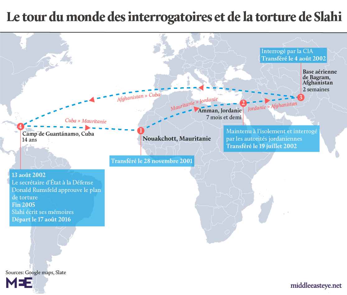 Agissant sous la pression des États-Unis, ce sont les autorités du pays natal de Mohamedou ould Slahi, la Mauritanie, qui, après l’avoir arrêté en 2001, l’ont remis aux commandos jordaniens. Il a ensuite été transféré à Amman, la capitale jordanienne, où il a été détenu pendant sept mois et demi en isolement avant d’être transféré par la CIA dans la tristement célèbre base aérienne de Bagram en Afghanistan.