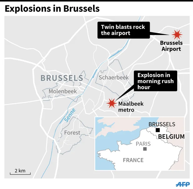 Environ une heure plus tard, une explosion a frappé un métro à la station de métro de Maelbeek. Des photos sur les réseaux sociaux ont montré une rame éventrée et un policier a confié à l’AFP : « Il y a des blessés, il y a des morts. Je ne sais pas combien. »