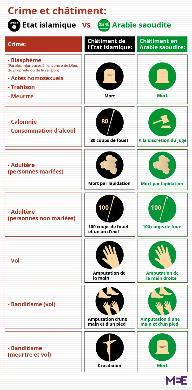 Des spécialistes de la région indiquent que bien que le royaume saoudien et l’Etat islamique diffèrent considérablement dans l'administration de ces châtiments (on recense peu de cas, voire aucun, d'exécution pour blasphème ou adultère en Arabie saoudite), leurs approches juridiques reposent sur la même doctrine wahhabite, une interprétation ultraconservatrice des textes sacrés de l'islam.