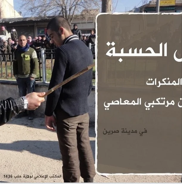 Châtiment corporel exécuté par des membres de l'Etat islamique à Sarrin, dans le wilaya d'Alep (Jihadology).