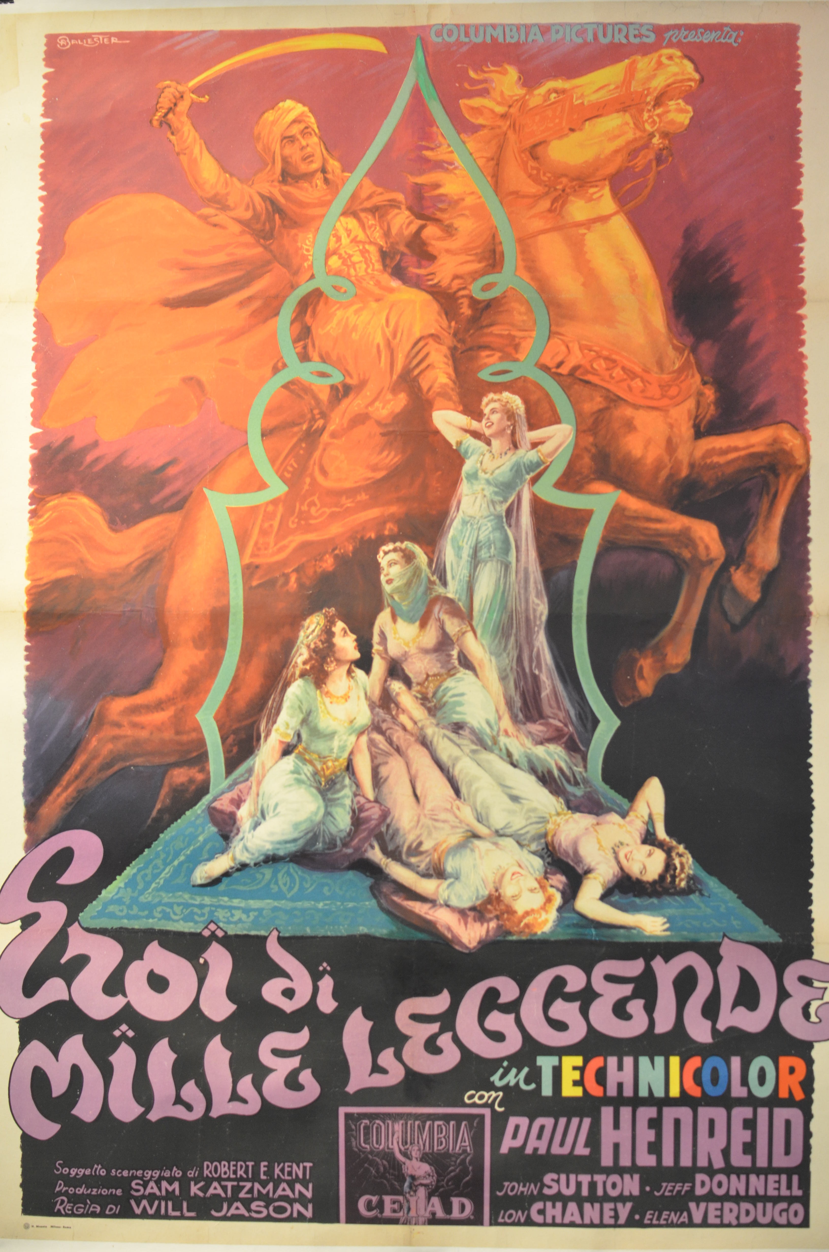Une affiche de La revanche d’Ali Baba de 1952 – « Un groupe d’amis partent en mission pour combattre le méchant sultan » – ne comporte aucune référence au groupe d’amis, privilégiant à la place un tas de femmes vêtues de magnifiques tenues vertes sur un tapis vert, auréolé par une silhouette de minaret stylisé, derrière lequel le sultan – dans des tons rouges diaboliques, les yeux brillants – brandit un cimeterre sur cheval cabré.