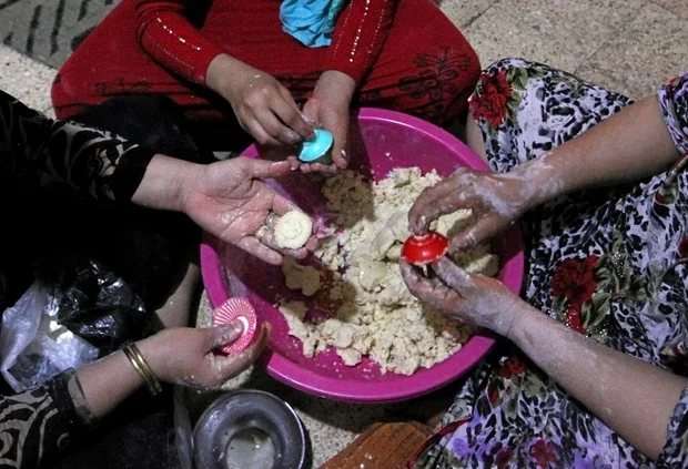 Sur la plaque sont disposés des kahk, des sablés au beurre traditionnels qui constituent un aliment de base lors des célébrations de l’Aïd el-Fitr, qui marquent la fin du mois sacré du Ramadan, au cours duquel les musulmans jeûnent de l’aube au crépuscule.