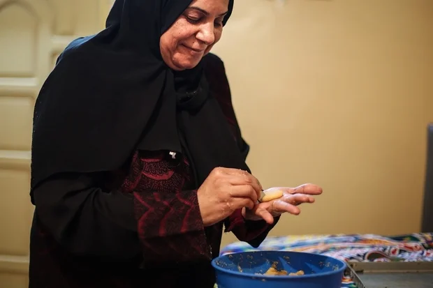 Nadia Ahmed, 52 ans, ajoute et mélange les ingrédients du kahk dans son appartement. Elle semble le faire les yeux fermés.