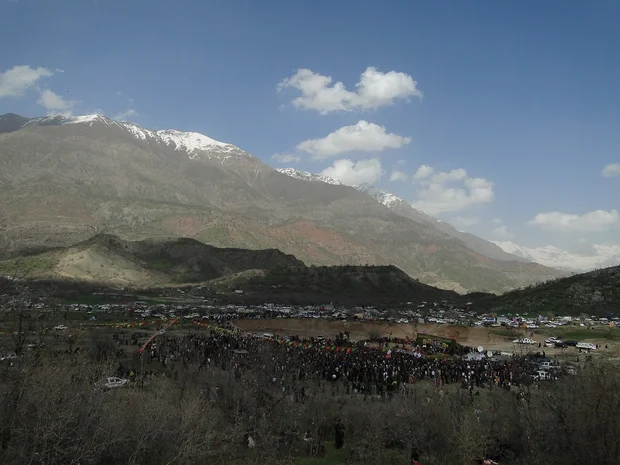 Au creux d’une large vallée entourée de montagnes enneigées, les organisateurs ont installé une estrade flanquée de centaines de drapeaux aux couleurs kurdes : rouge, jaune, vert. L’étoile rouge du PKK est omniprésente, tout comme les drapeaux arborant le soleil, symbole zoroastrien que se sont réappropriés les Kurdes, y voyant la marque de leur religion ancestrale.