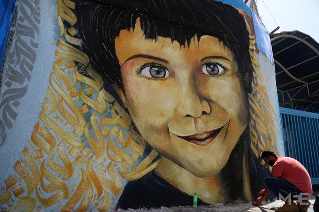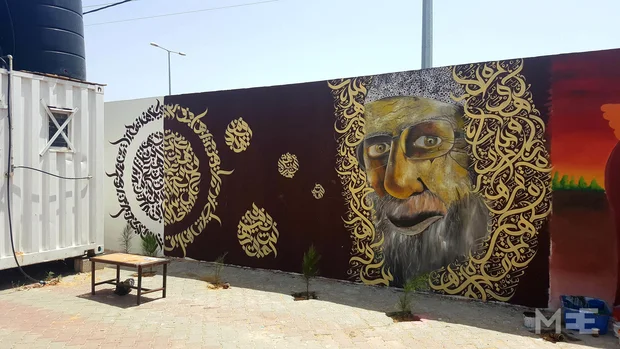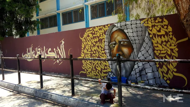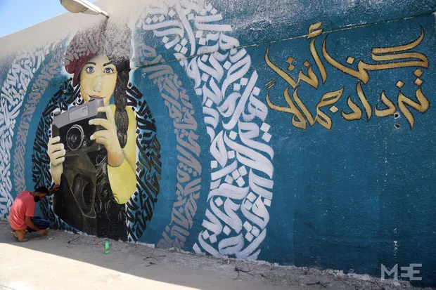 Sur le mur d’un autre bâtiment à Gaza, il a peint l’image d’une jeune fille tenant un appareil photo entourée de cercles concentriques composés de lettres arabes. « Soyez vous-même et votre beauté s’accroîtra », indiquent ces mots.