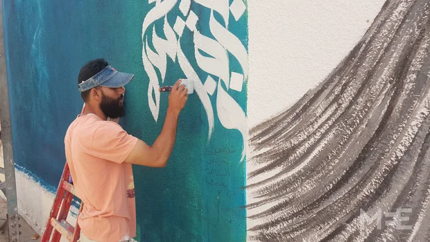 « Le calligraffiti est la fusion de la calligraphie et des graffitis, un art de plus en plus global », explique-t-il à Middle East Eye, en prenant une pause et s’éloignant de sa dernière création.