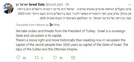 Israël Katz, ministre israélien du Renseignement et des transports, a rejeté la menace de la Turquie sur Twitter et réitéré la position d’Israël sur la ville, qui représente l’une des nombreuses pierres d’achoppement des négociations de paix avec les Palestiniens : « Nous ne prenons pas d’ordres ni n’acceptons les menaces du président de la Turquie », a-t-il écrit.