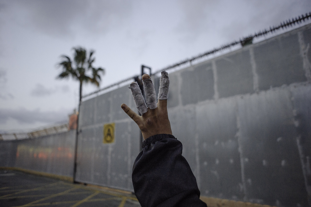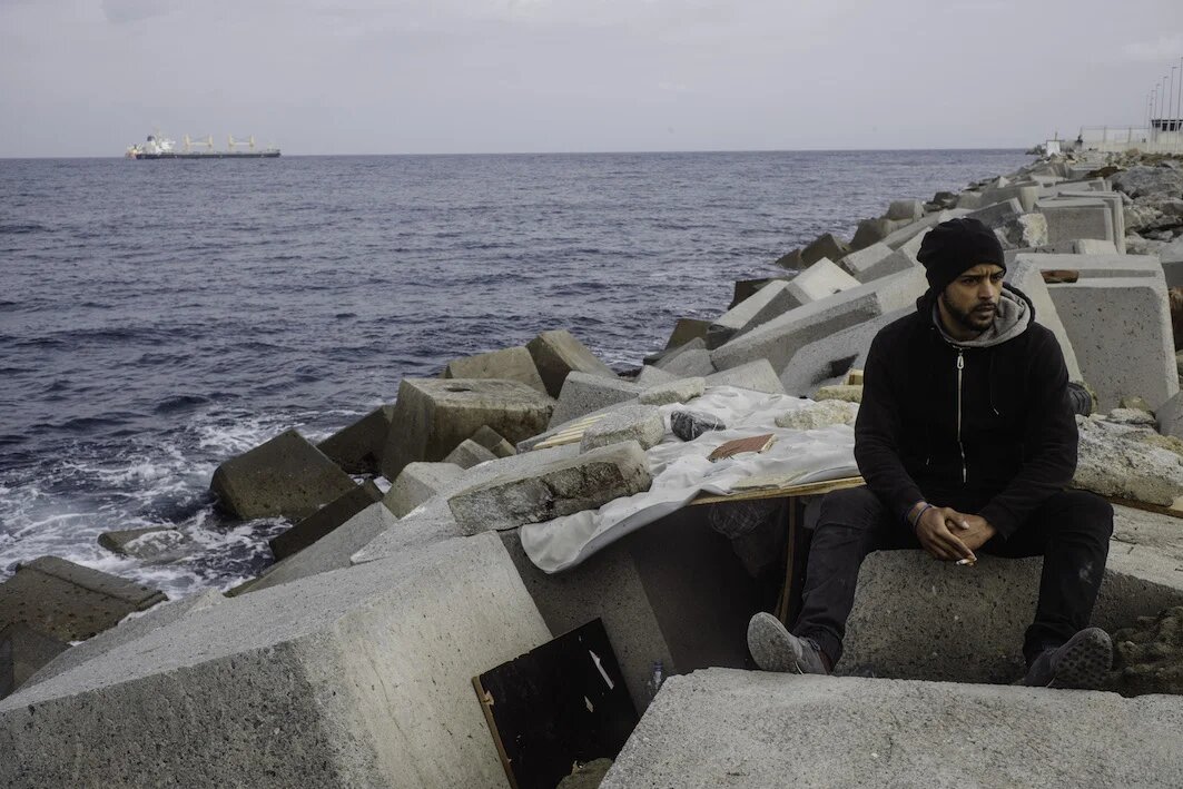 Mustafa Arafi, 26 ans, est Algérien. Marié à Katya, une Allemande, il a pourtant été expulsé du pays. Depuis un mois dans le port de Ceuta, il attend de pouvoir monter sur un ferry. Dans les blocs de béton qui font barrage à la mer, il s’est confectionné un abri pour dormir. Le 17 février 2019 .