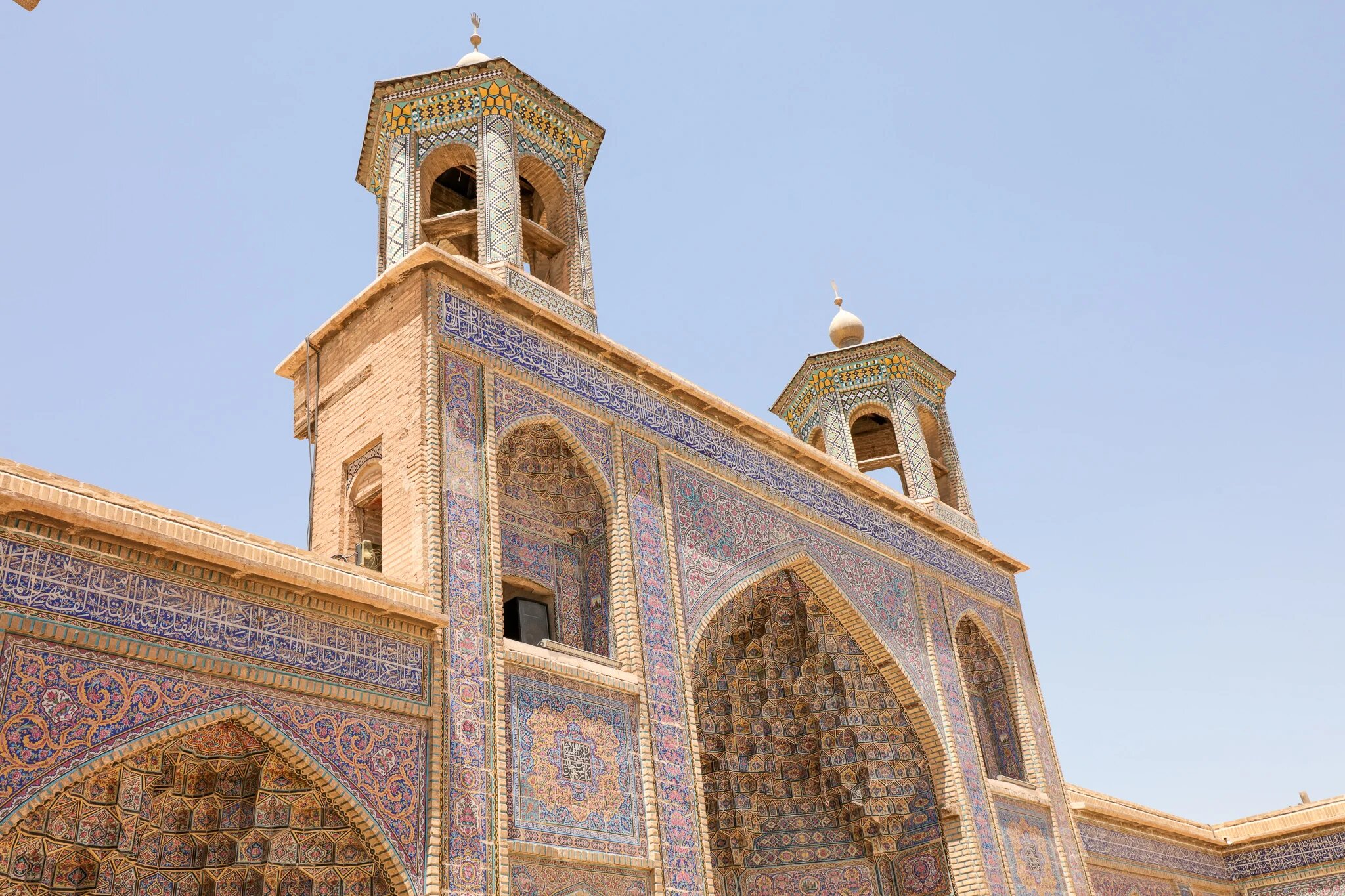 La mosquée Nasir-ol-Molk à Chiraz, plus connue sous le nom de « mosquée rose » en raison de la couleur de ses tuiles, est peut-être la mosquée la plus visitée d’Iran. Achevée en 1888, au cours des derniers jours de la dynastie Kadjar, elle est surtout connue pour le vaste verre coloré de sa façade et le Panj Kase (cinq concaves, éléments traditionnels) sous les arches intérieures de la mosquée (Ali Afaq).