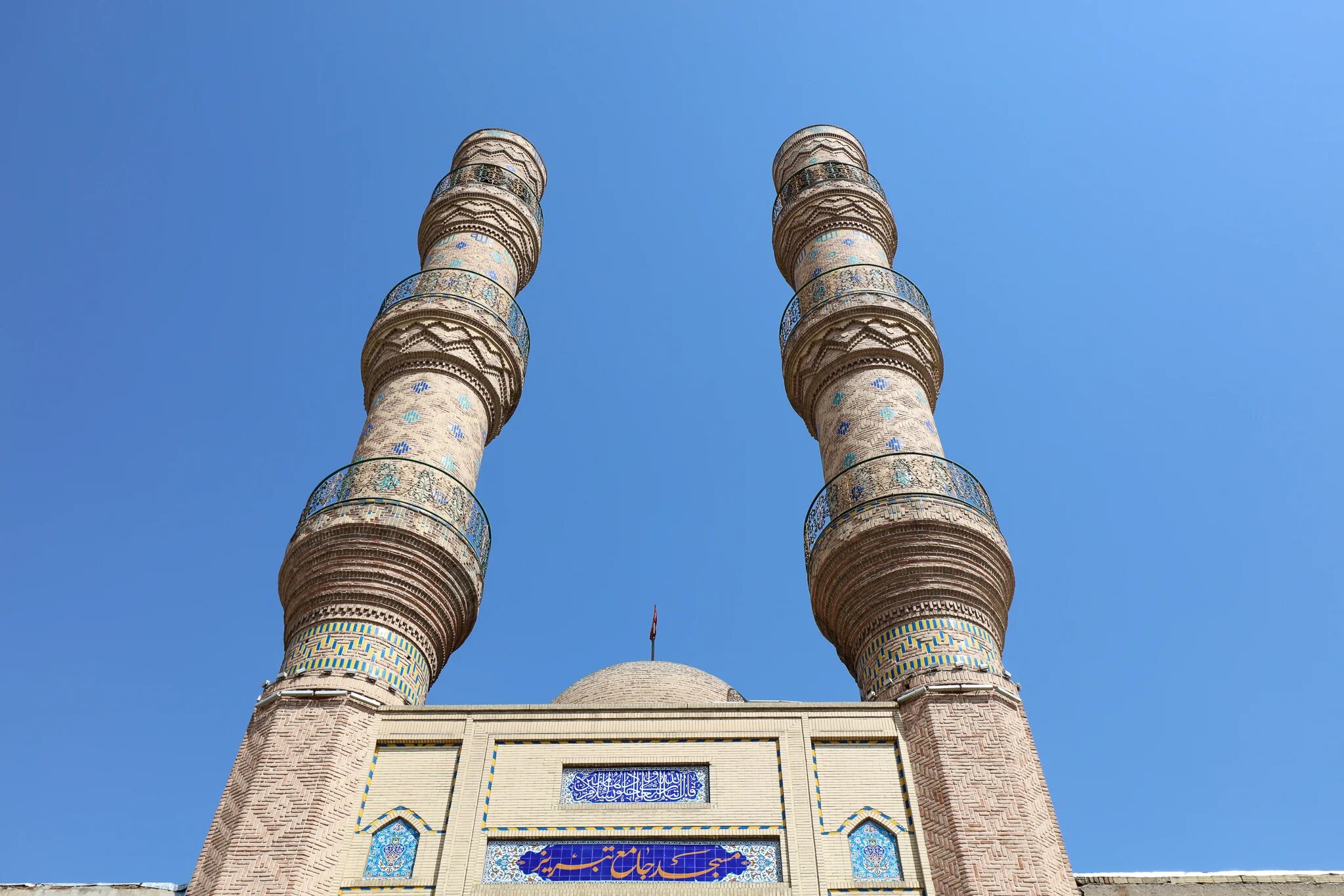 La mosquée Jameh à Tabriz est située dans l’Azerbaïdjan oriental. Elle est adjacente au grand bazar, site classé au patrimoine mondial de l’UNESCO, l’un des plus grands marchés couverts du monde, datant d’au moins huit siècles. La structure d’origine de la mosquée n’existe plus : le bâtiment actuel date du XVIIe siècle. Il est orné de deux minarets géants avec des ponts à plusieurs niveaux, une caractéristique rare des mosquées iraniennes mais que l’on trouve souvent en Afrique du Nord (Ali Afaq).