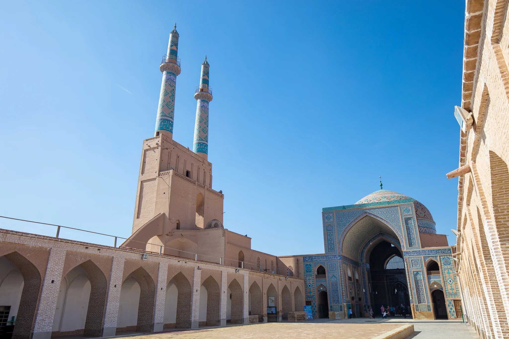 La mosquée Jameh, ou mosquée du Vendredi de Yazd, date du XIIe siècle. Certains historiens affirment qu’elle a été construite sur le site d’un temple du feu sassanide (dynastie perse ayant régné sur le Grand Iran de 224 à l’invasion musulmane en 651), alors que la religion principale de la région était le zoroastrisme. La plupart des mosquées du vendredi en Iran étaient autrefois des temples du feu – l’un de ces temples à Yazd avait un feu allumé depuis 1 500 ans. La mosquée est surmontée de deux minarets de 52 mètres qui comptent parmi les plus hauts d’Iran. Contrairement à la plupart des mosquées iraniennes, les tours ne sont pas placées de part et d’autre du dôme central (Ali Afaq).